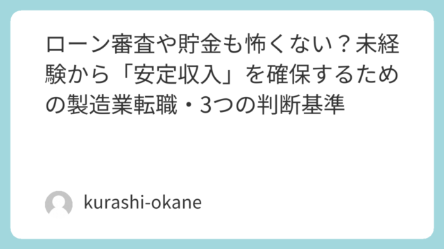 転職 ローン審査や貯金も怖くない?未経験から「安定収入」を確保するための製造業転職・3つの判断基準 「今の生活費、キツい…」と感じていませんか?元銀行員の視点で、地方×製造業が家計の救世主になる理由を解説。住居費を抑え、着実に貯金を作るための判断基準と、ココカラ・ワーク活用のコツ 2026.02.14 転職